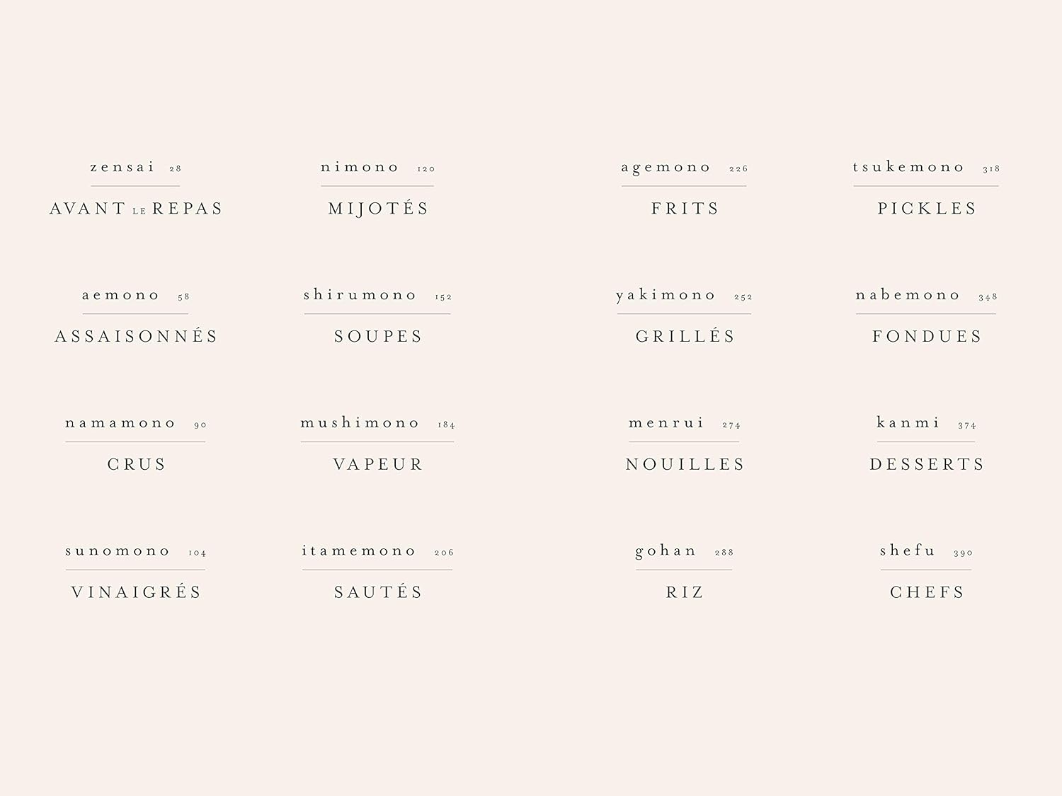 L’ouvrage présente 15 chapitres thématiques : soupes, sauces, légumes, fritures, plats mijotés, riz, nouilles, desserts, pickles, et bien plus. Chaque recette est introduite par des contextes culturels ou anecdotes, avec des explications sur les ingrédients japonais essentiels, leurs substitutions possibles, ainsi que des conseils de présentation.